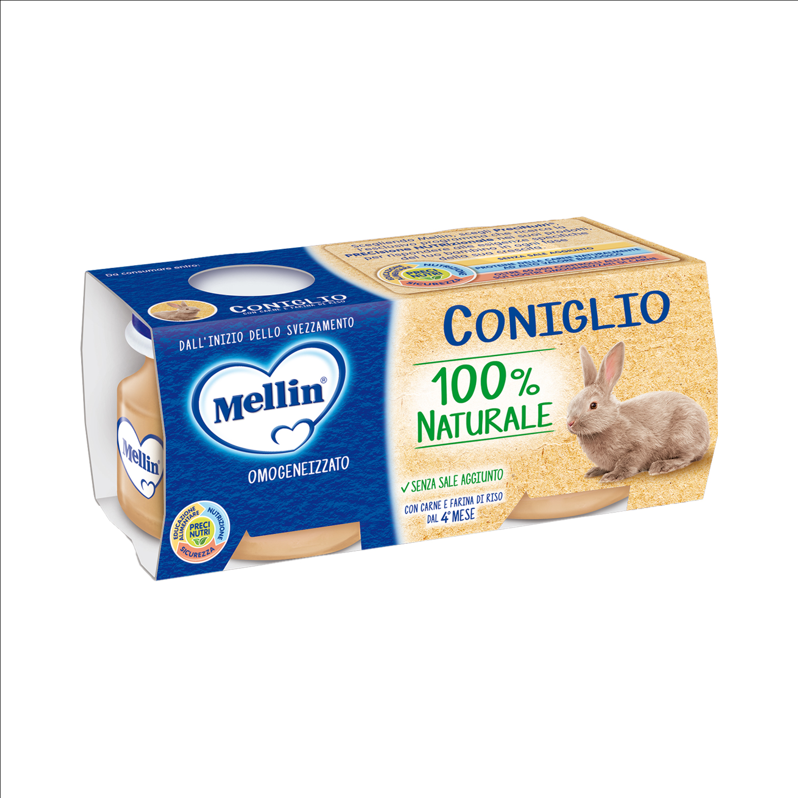 Omogeneizzato con carne di coniglio e cereale (farina di riso). Alimento per l'infanzia dal 4° mese.