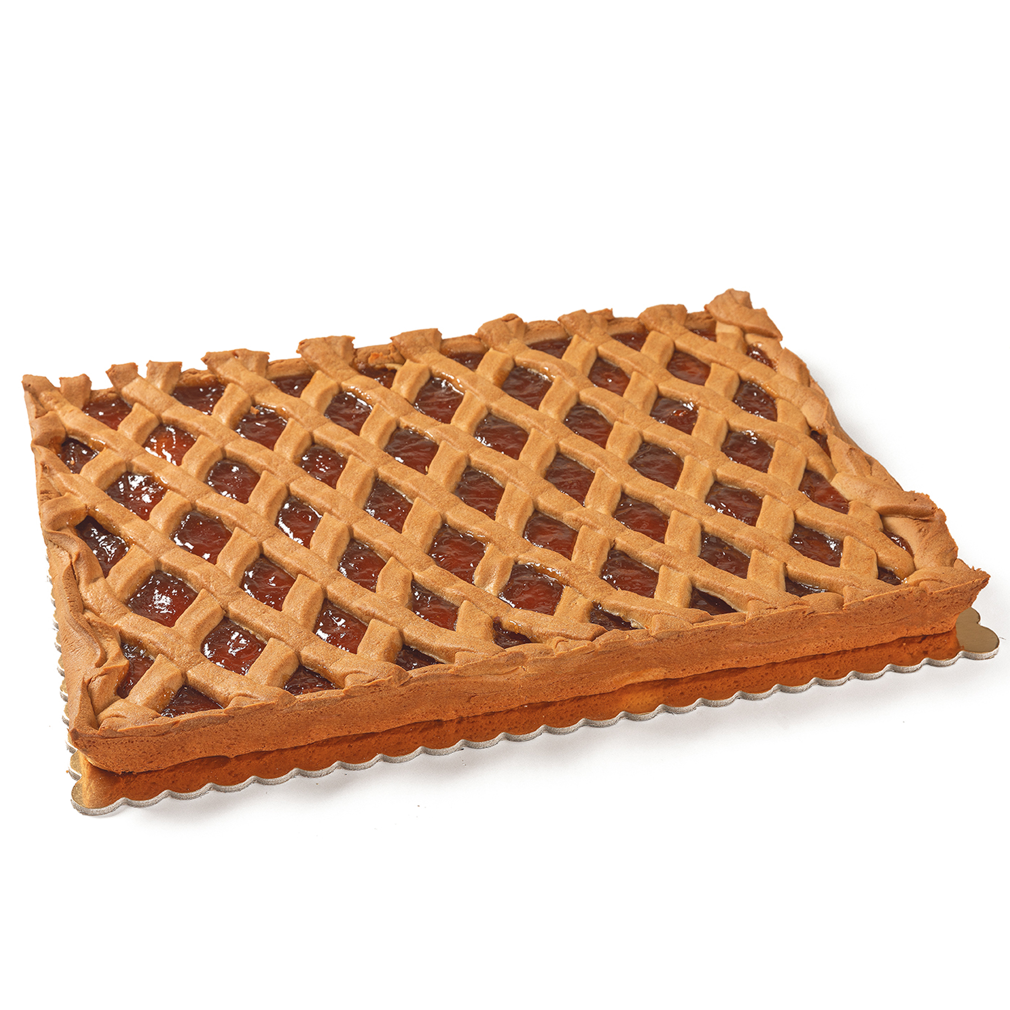 Crostata di pasta frolla al burro, abbondantemente arricchita da confettura di albicocca, rettangolare, congelata.