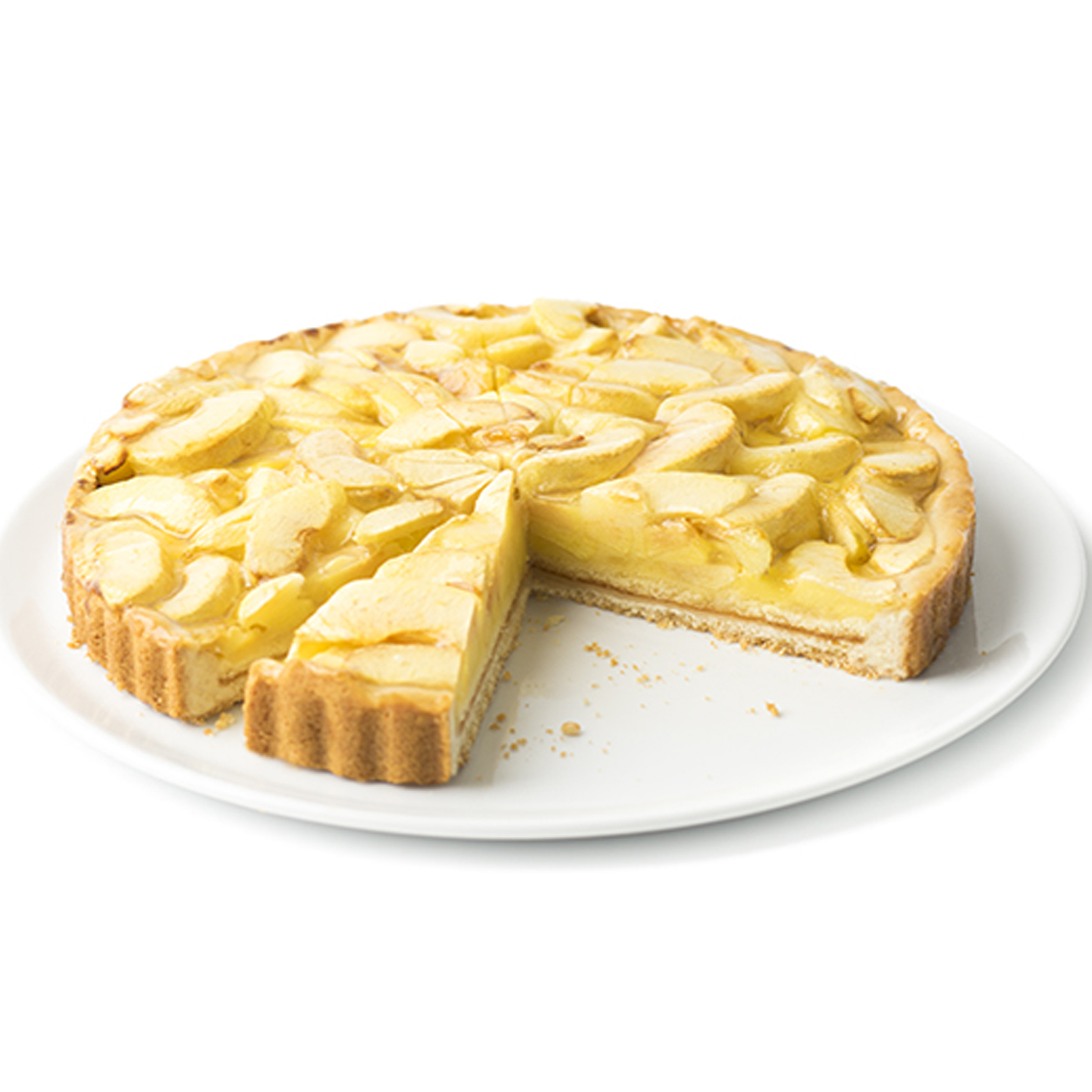 Dalla tradizionale ricetta artigianale, fragrante pasta frolla e morbido pan di spagna ricoperti di crema, spicchi di mele (40%) e gelatina.