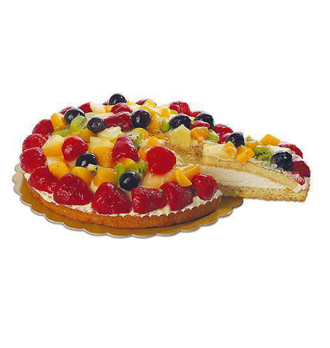 Base di morbida pasta frolla ricoperta di crema chantilly e guarnita con frutti misti (35%) e gelatina.