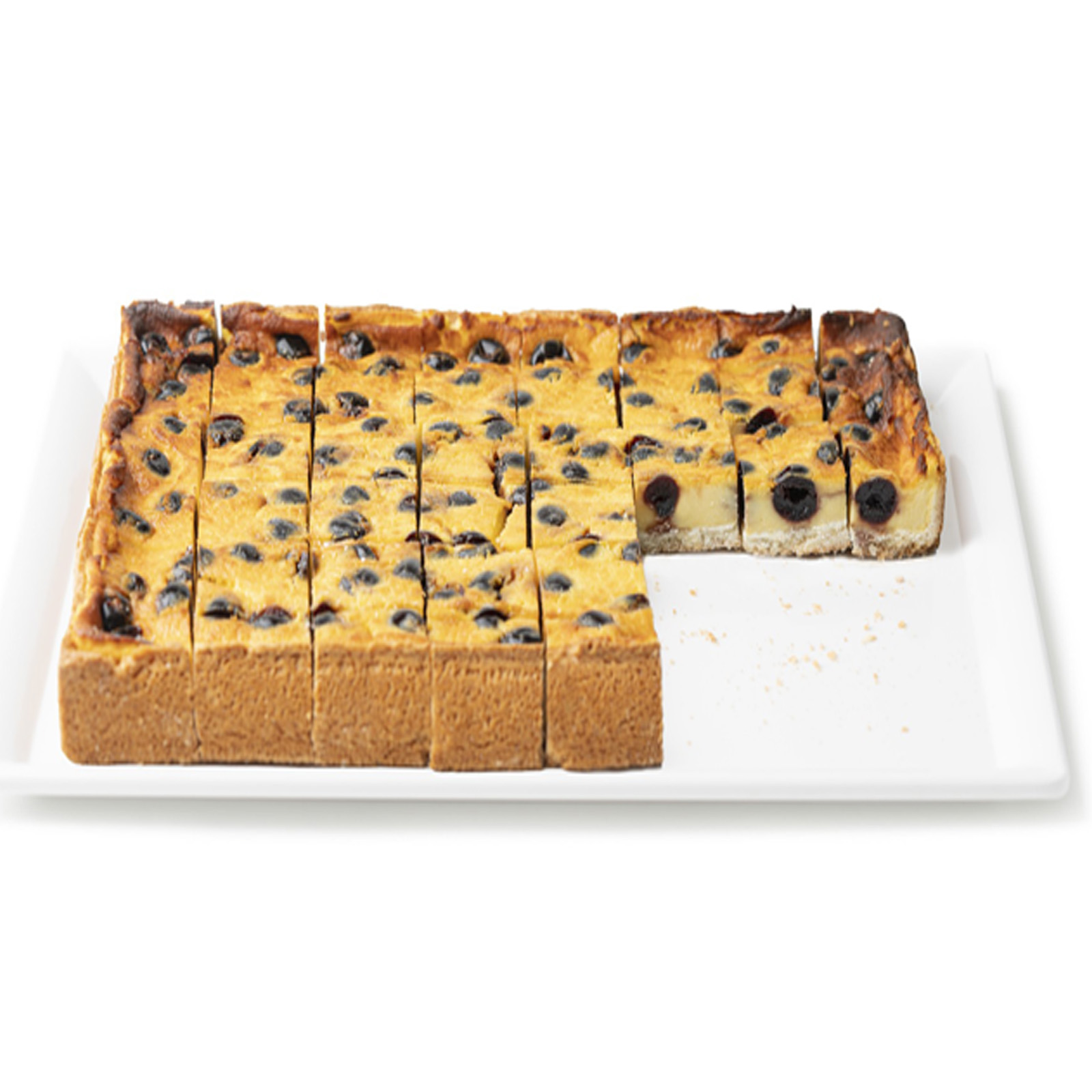 maxi crostata farcita con crema pasticcera e ciliegie candite, gia' porzionata in 48 pezzi da c.ca 50 gr. servita su vassoio di carta.