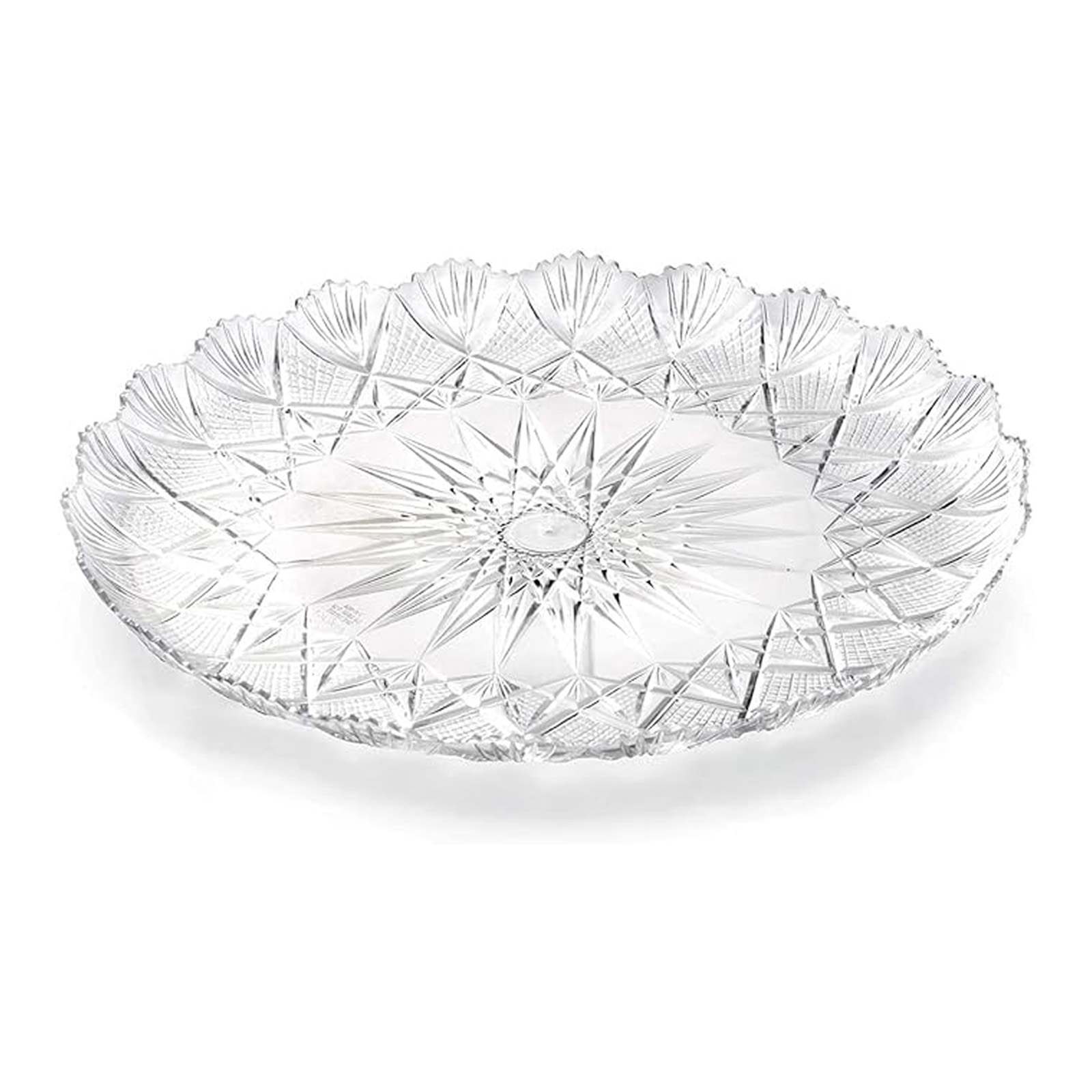 Vassoio trasparente con decorazione ad incisione sul fondo e sul bordo. Ideale per servire torte e semifreddi.