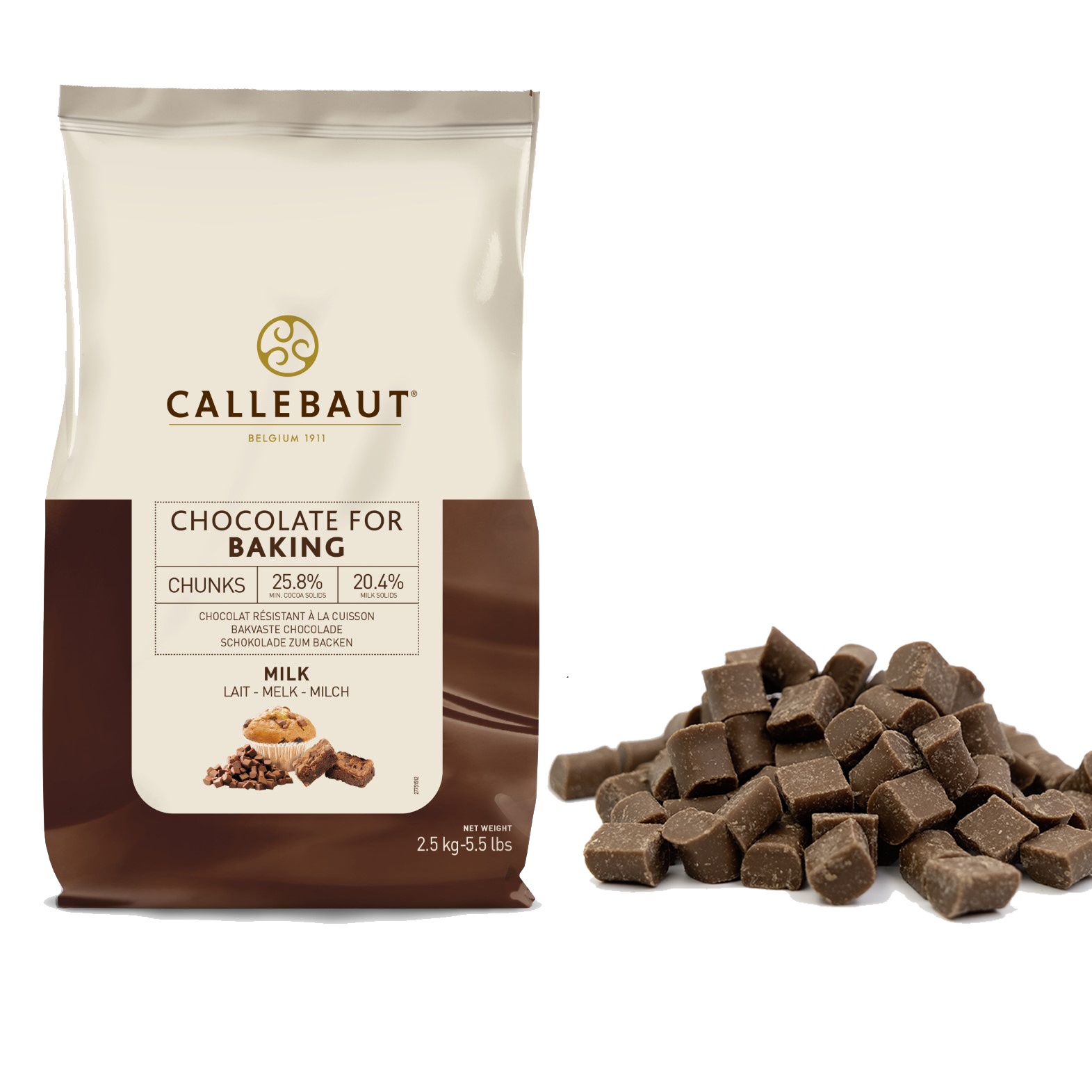 PEZZETTI DI CIOCCOLATO AL LATTE DI MEDIE DIMENSIONI PER LA COTTURA. CALLEBAUT