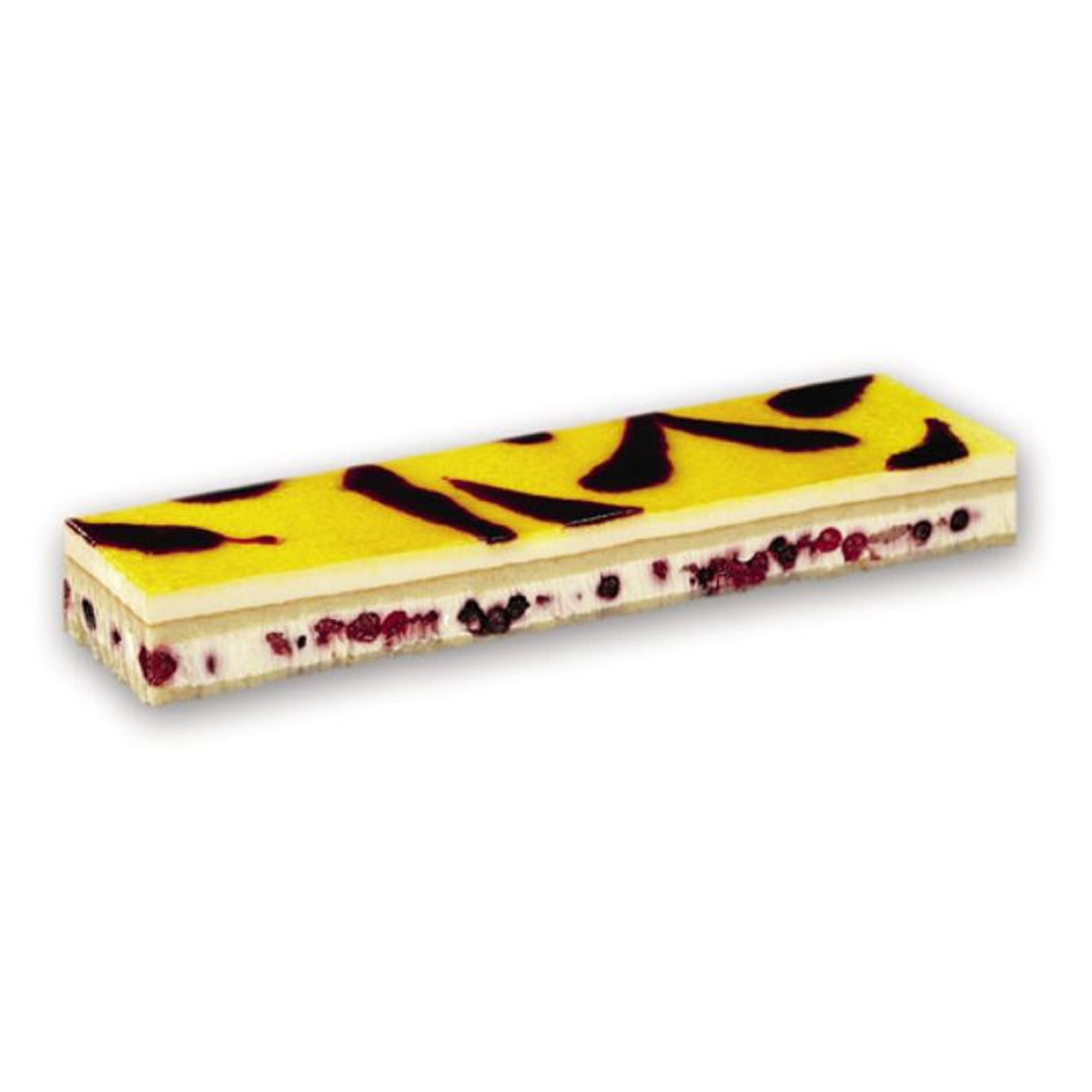 Pan di spagna arricchito con l'8% di mandorla e decorato con coulis. All’interno, una vellutata crema bavarese al lime farcita con 15% di frutti di bosco. Un incontro raffinato e irrinunciabile!