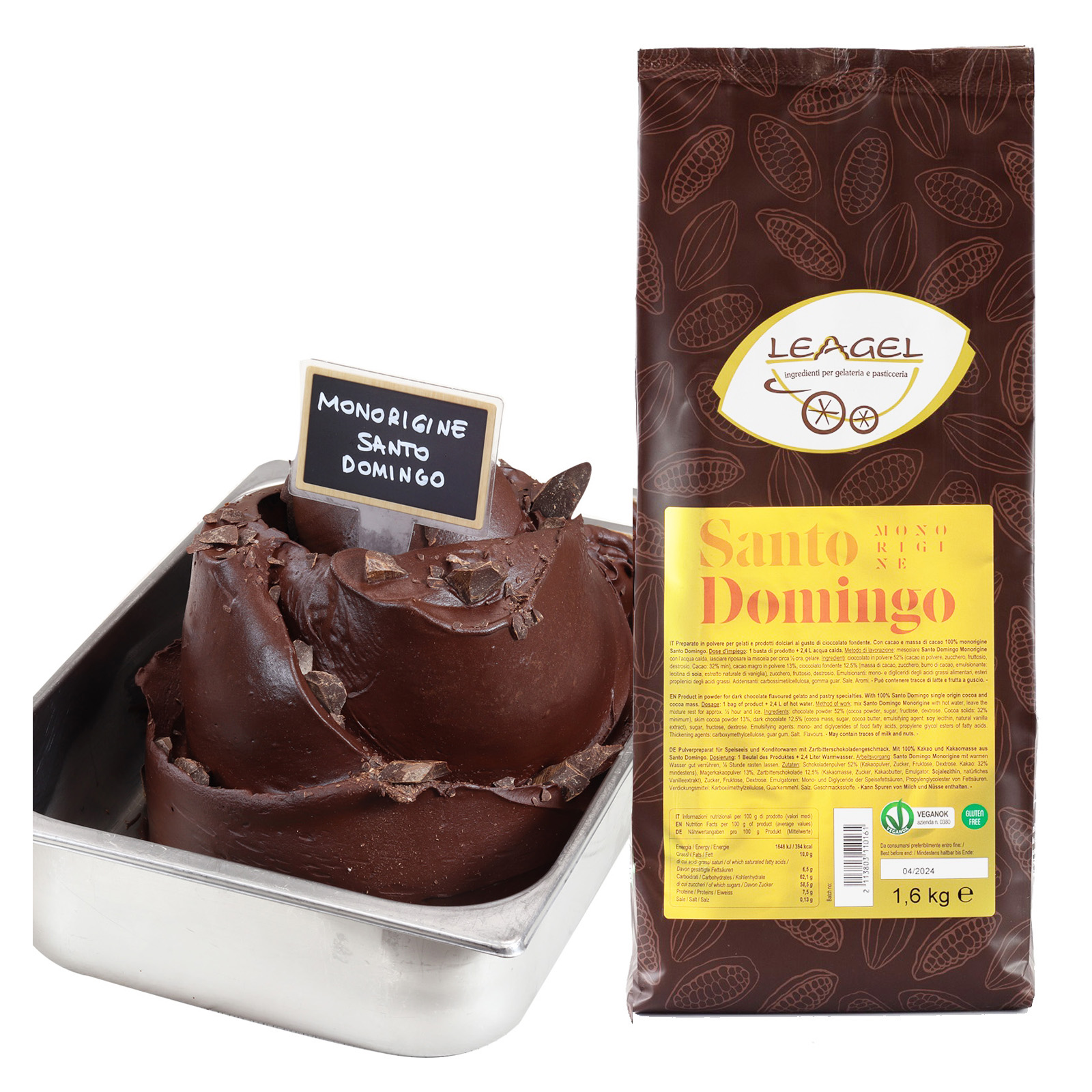 Mix completo in polvere pronto all'uso. Lavorazione a freddo con acqua. Gelato al cioccolato fondente monorigine Santo Domingo, dal gusto intenso e persistente con delicate note di frutta secca tostata.