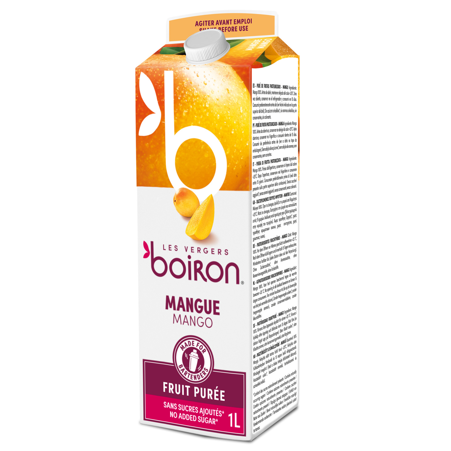 Purea di mango senza zucchero pastorizzata, temperatura ambiente. Ideale per gelati, sorbetti, mousse di frutta, gelatine di frutta, semifreddi, coulis, nappage, granite e cocktail.